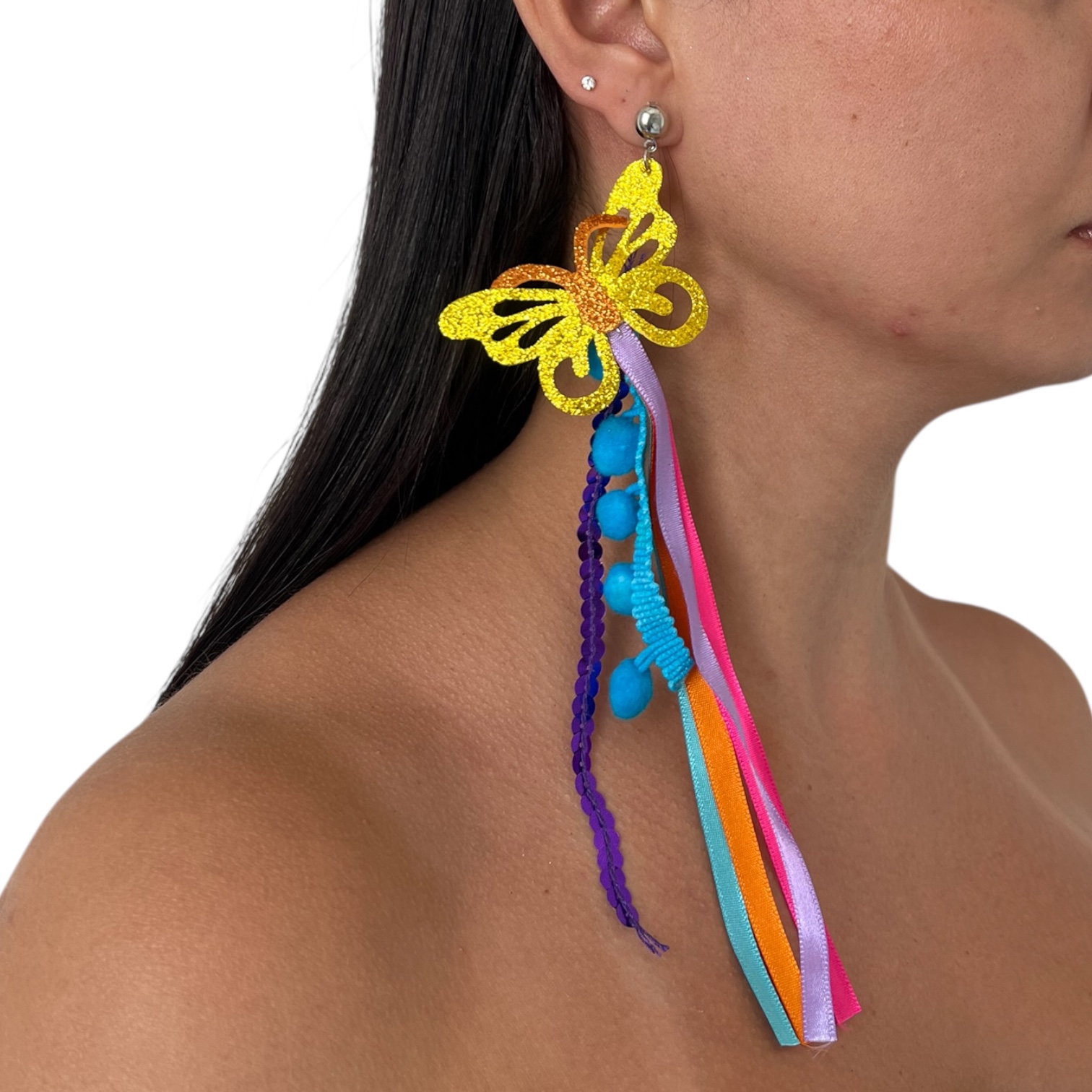 Brinco Carnaval Borboleta Fitas Pompom Bijuteria