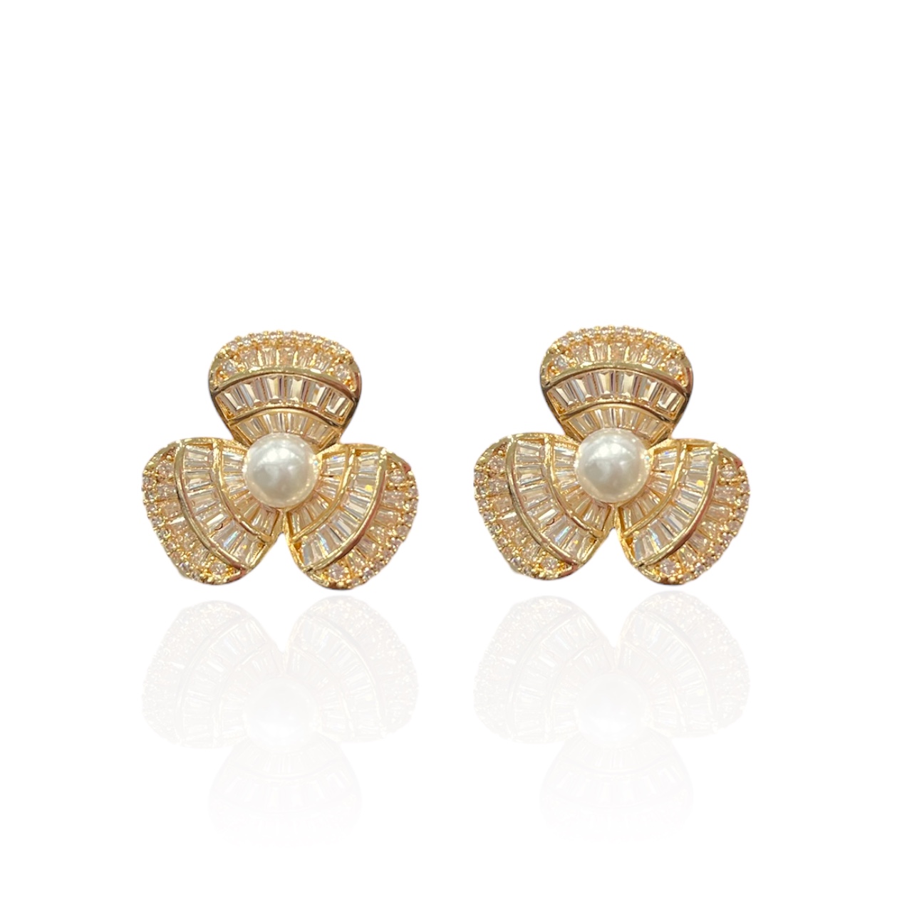 Brinco Folheado Ouro 18k e Prata 925 Flor Pérola Cravejada