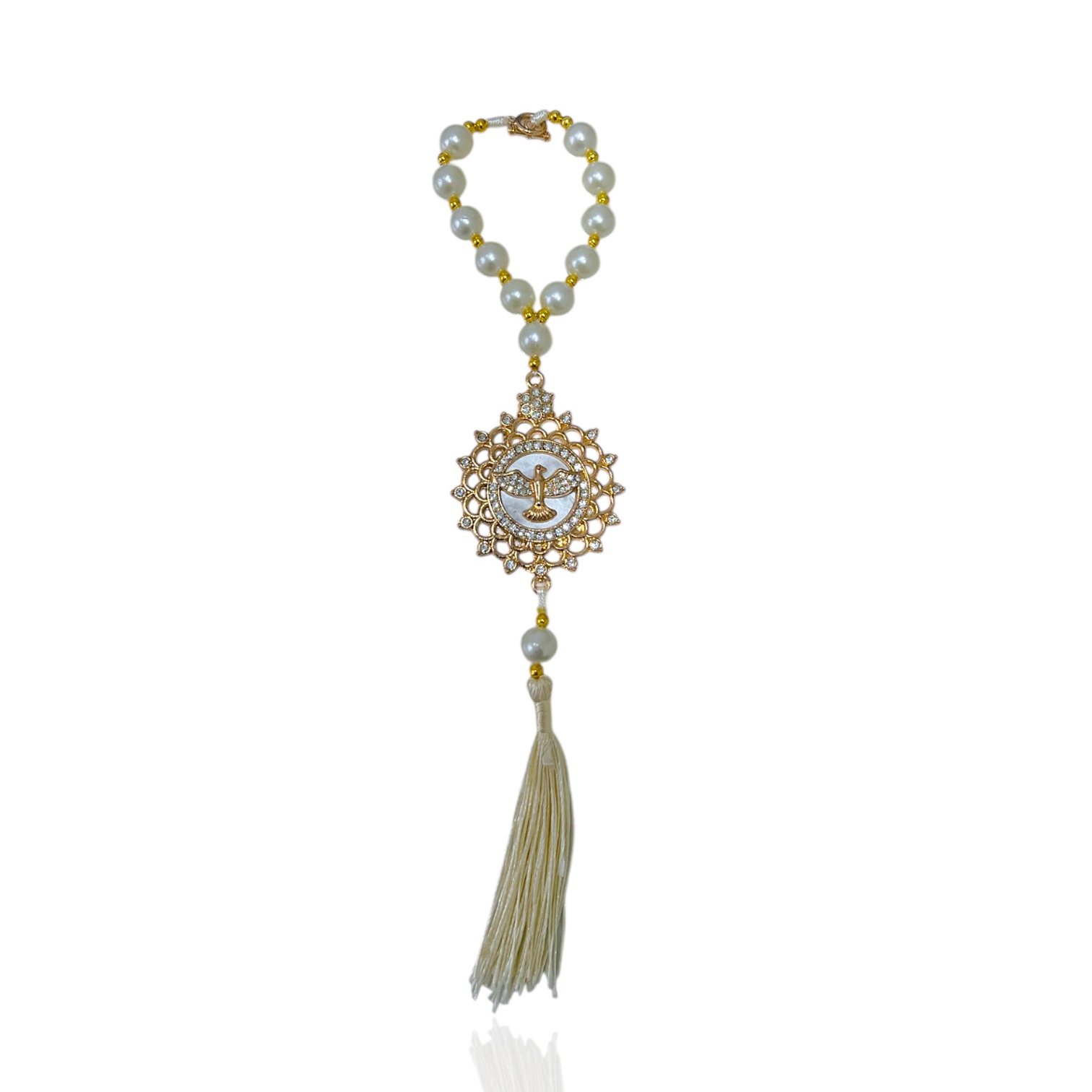 Chaveiro Terço Pérolas Espírito Santo Strass