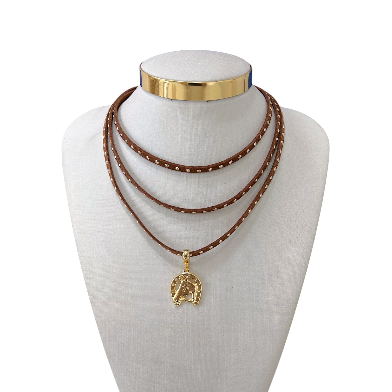 Choker Couro Tripla Bijuteria Dourado Country Ferradura Cavalo