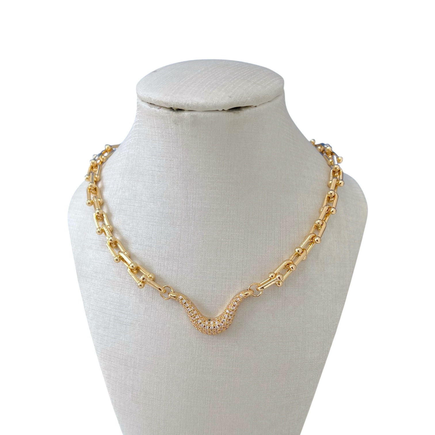 Colar Folheada Ouro 18k e Prata 925 Elos Bolinhas Cravejado Ondulado