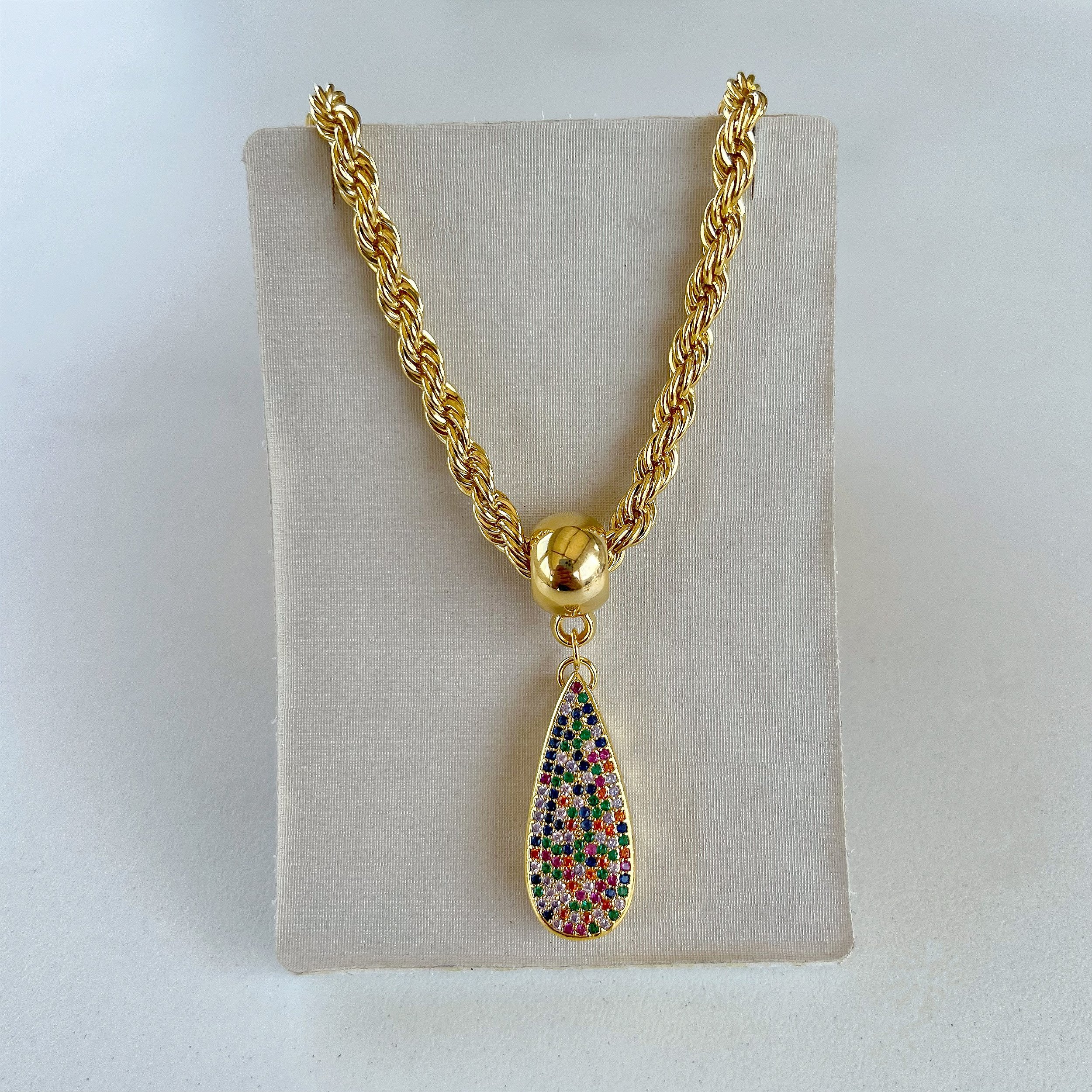Colar Folheado Ouro 18k Cordão Baiano Grosso Gota Cravejada Color