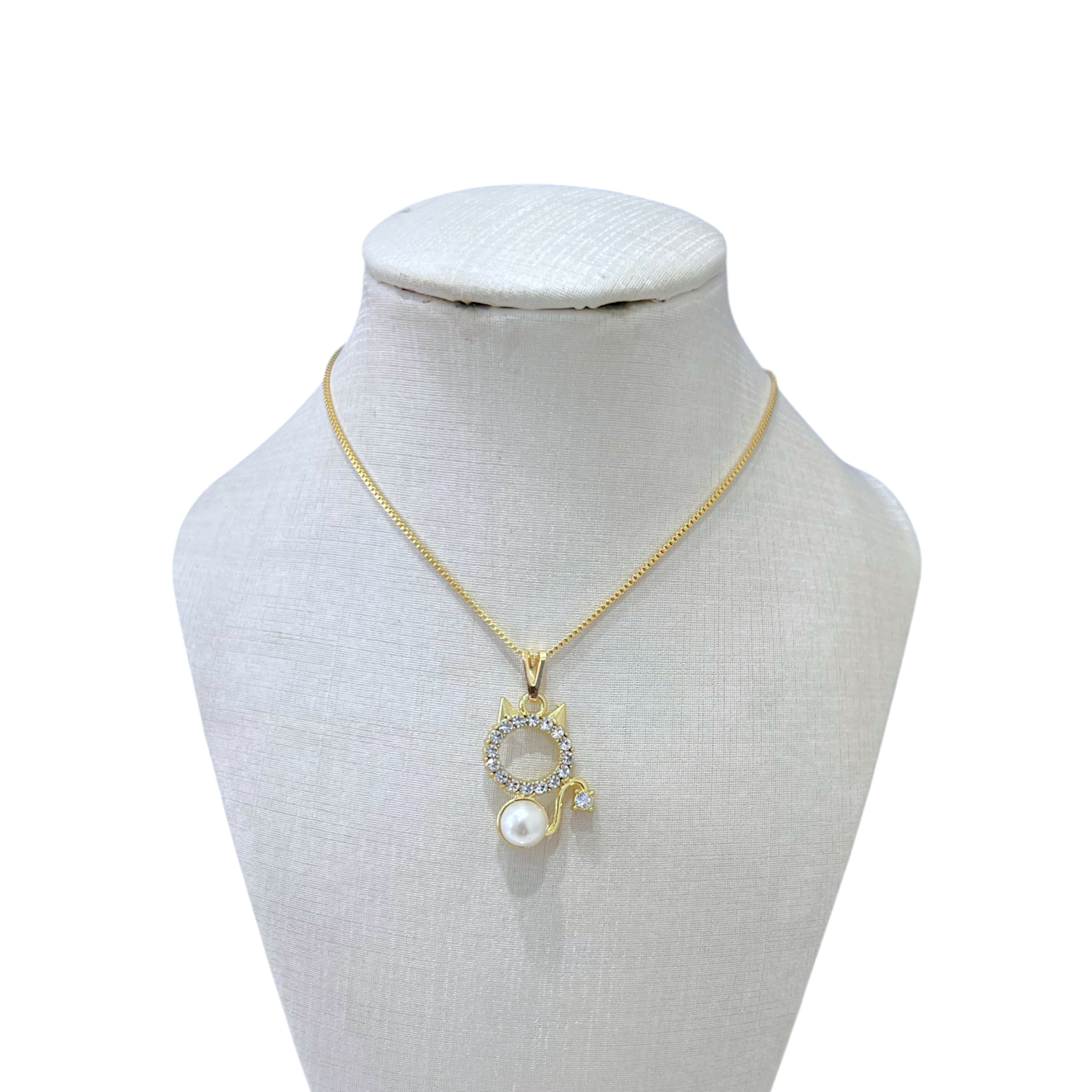 Colar Folheado Ouro 18k Gato Pérola Strass