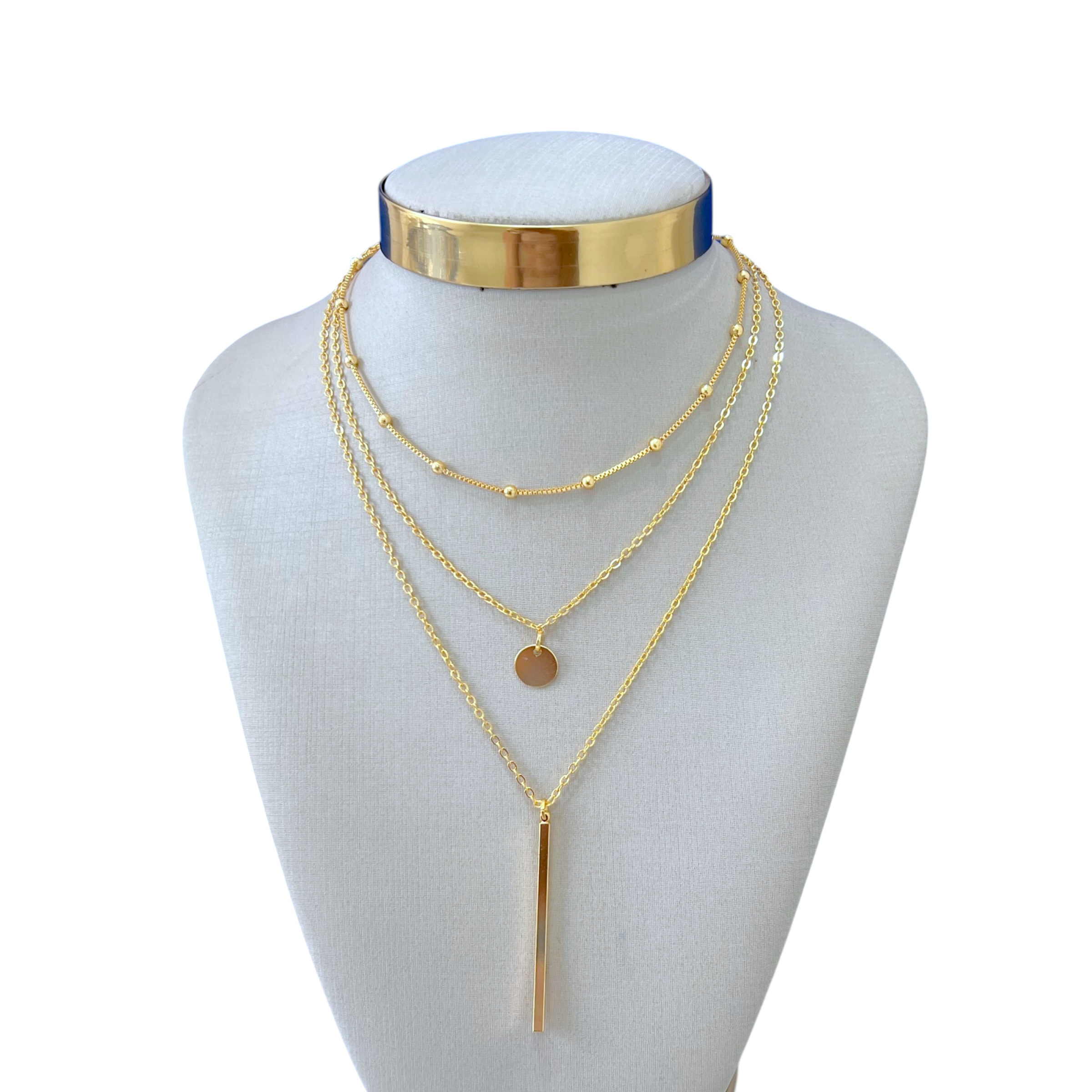 Colar Triplo Folheado Ouro 18k e Prata 925 Medalha Palito