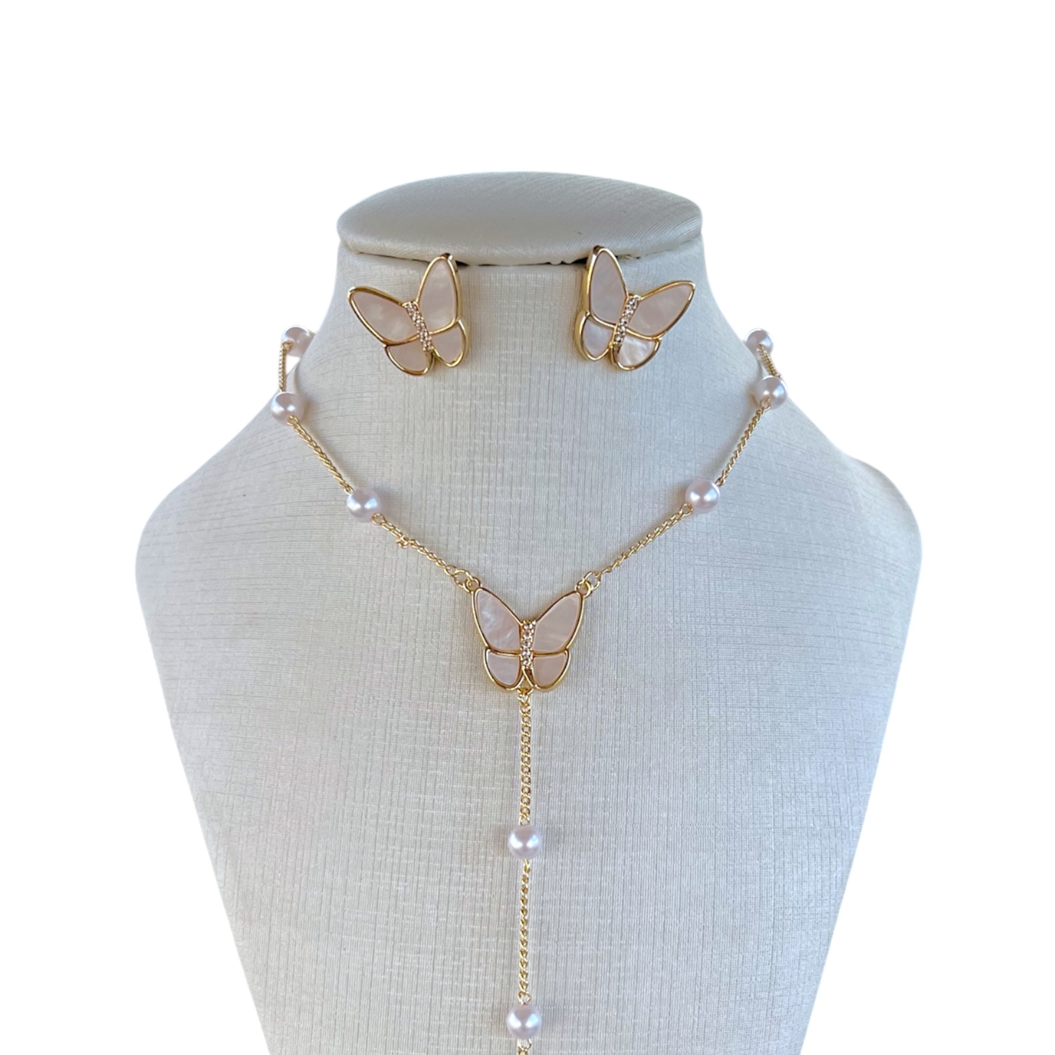 Conjunto Folheado Ouro 18k e Prata 925 Borboleta Gravatinha Madrepérolas