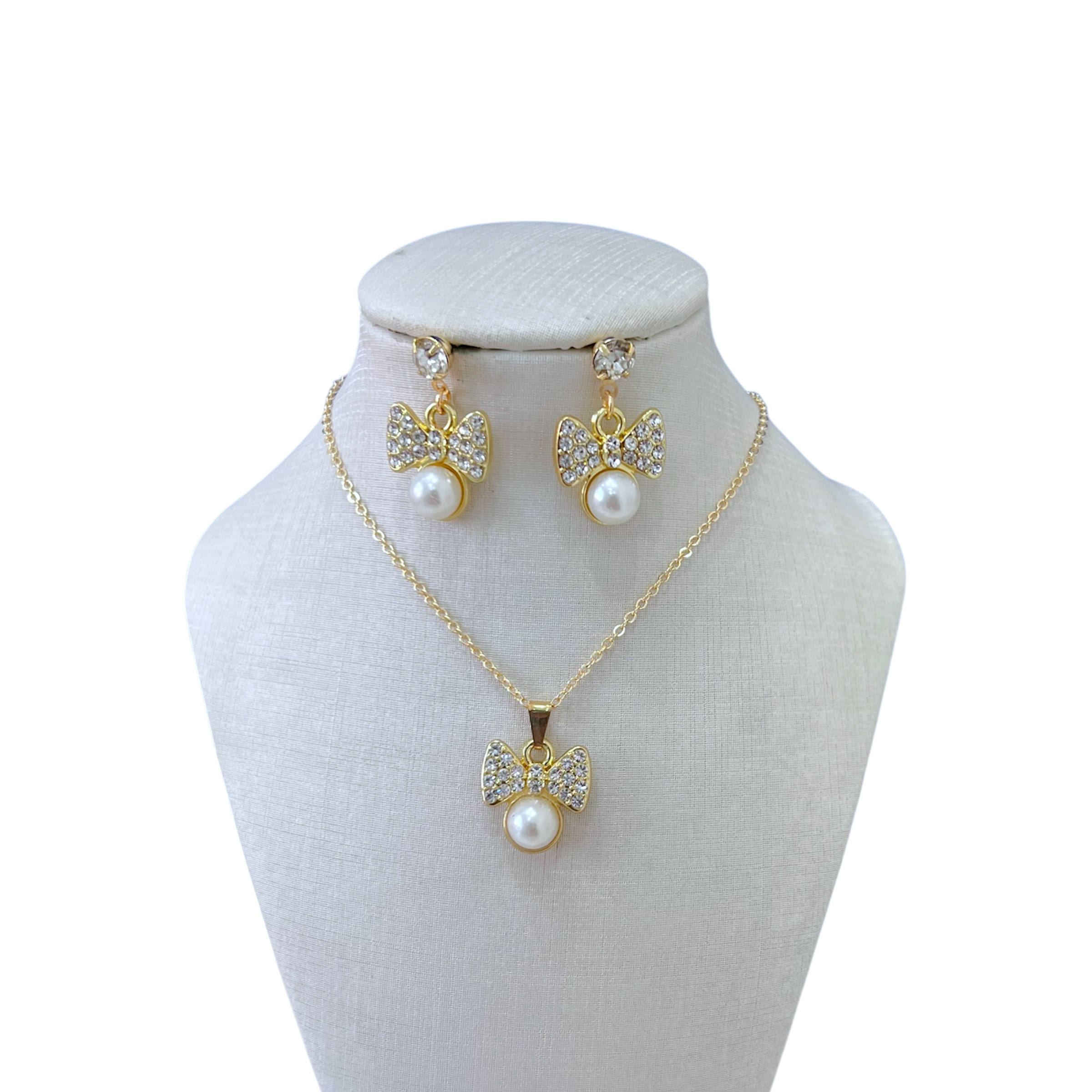 Conjunto Folheado Ouro 18k Laço Pérola Strass