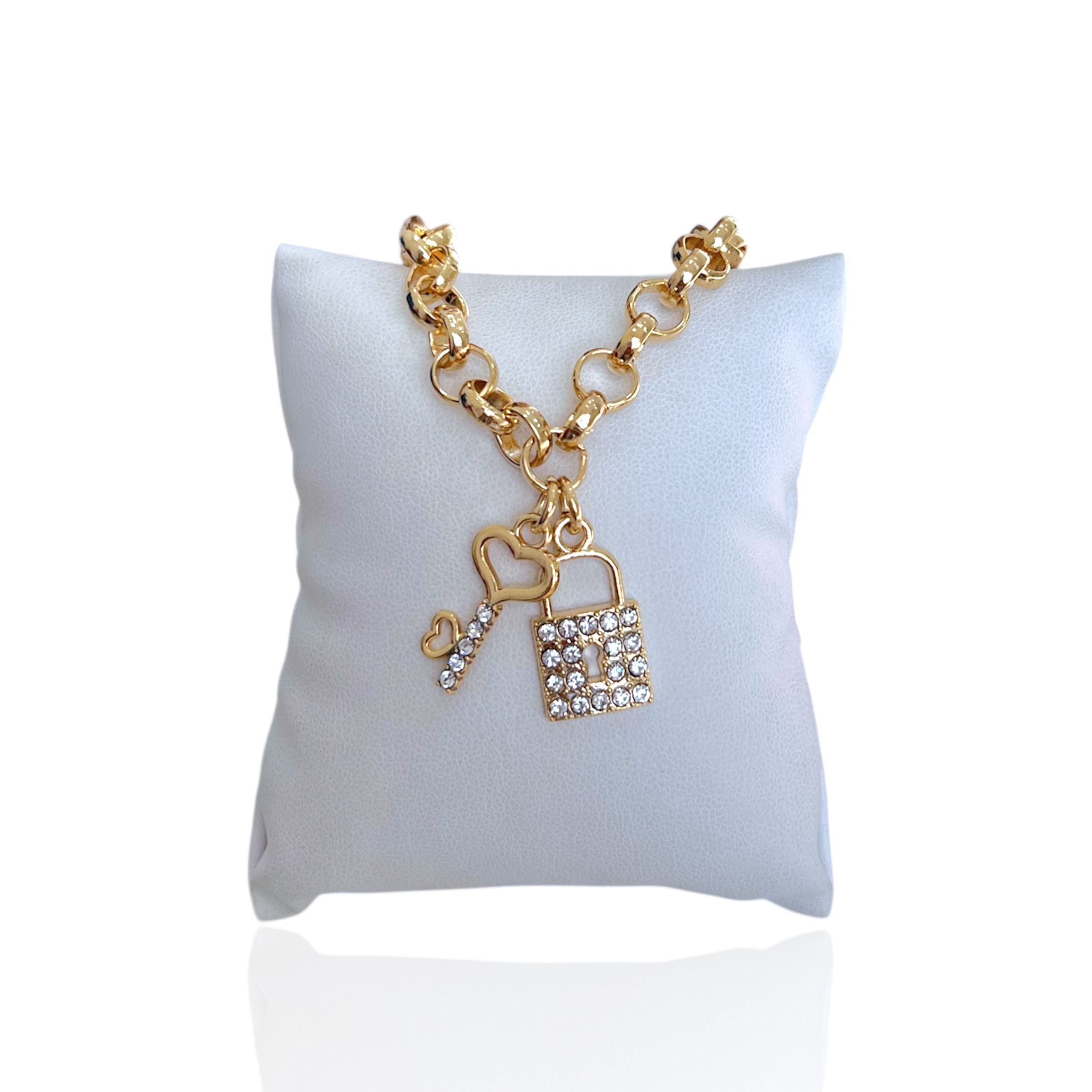 Pulseira Folheada Ouro 18k Elos Português Cadeado Chave Cravejada