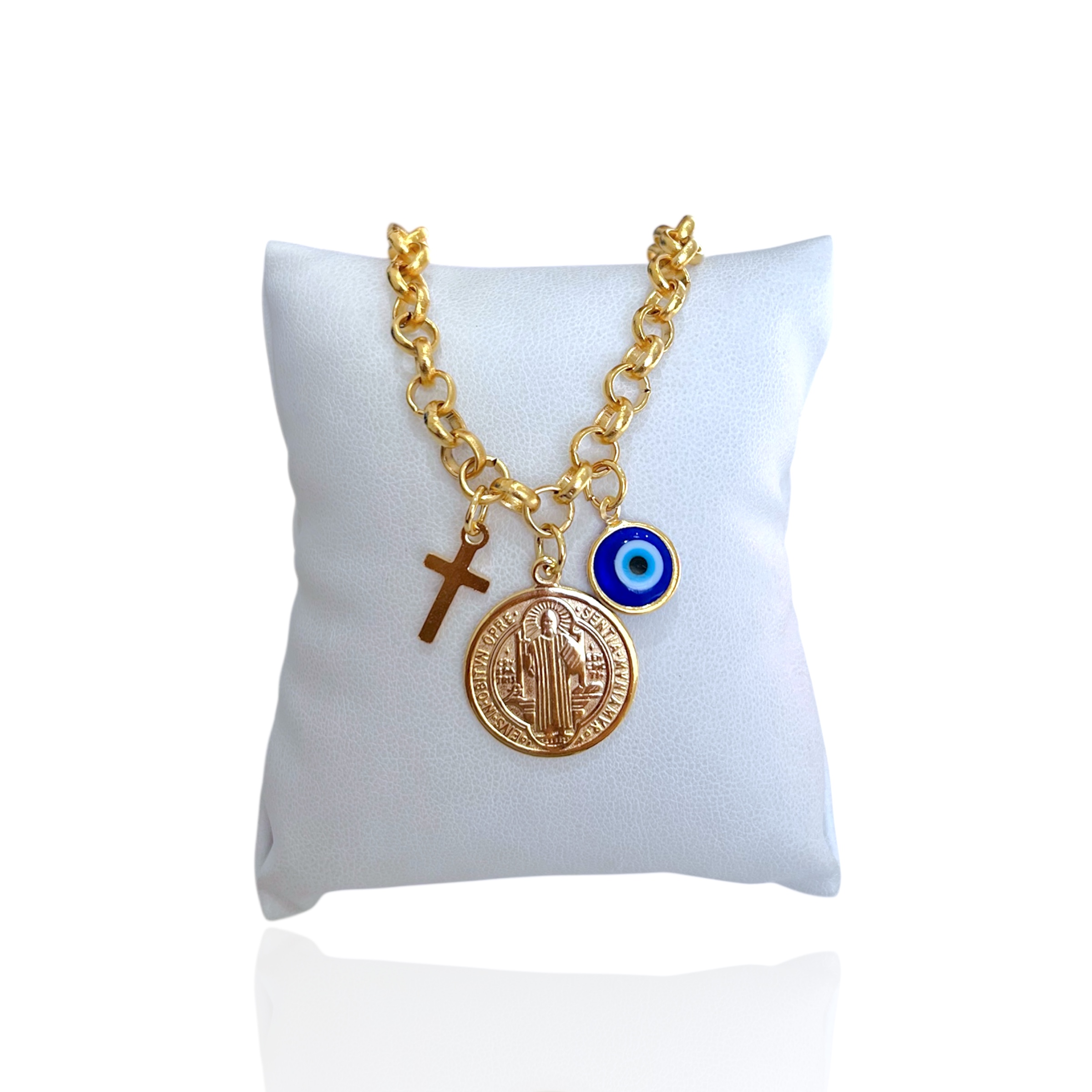 Pulseira Folheada Ouro 18k Elos Português São Bento Olho Grego Cruz