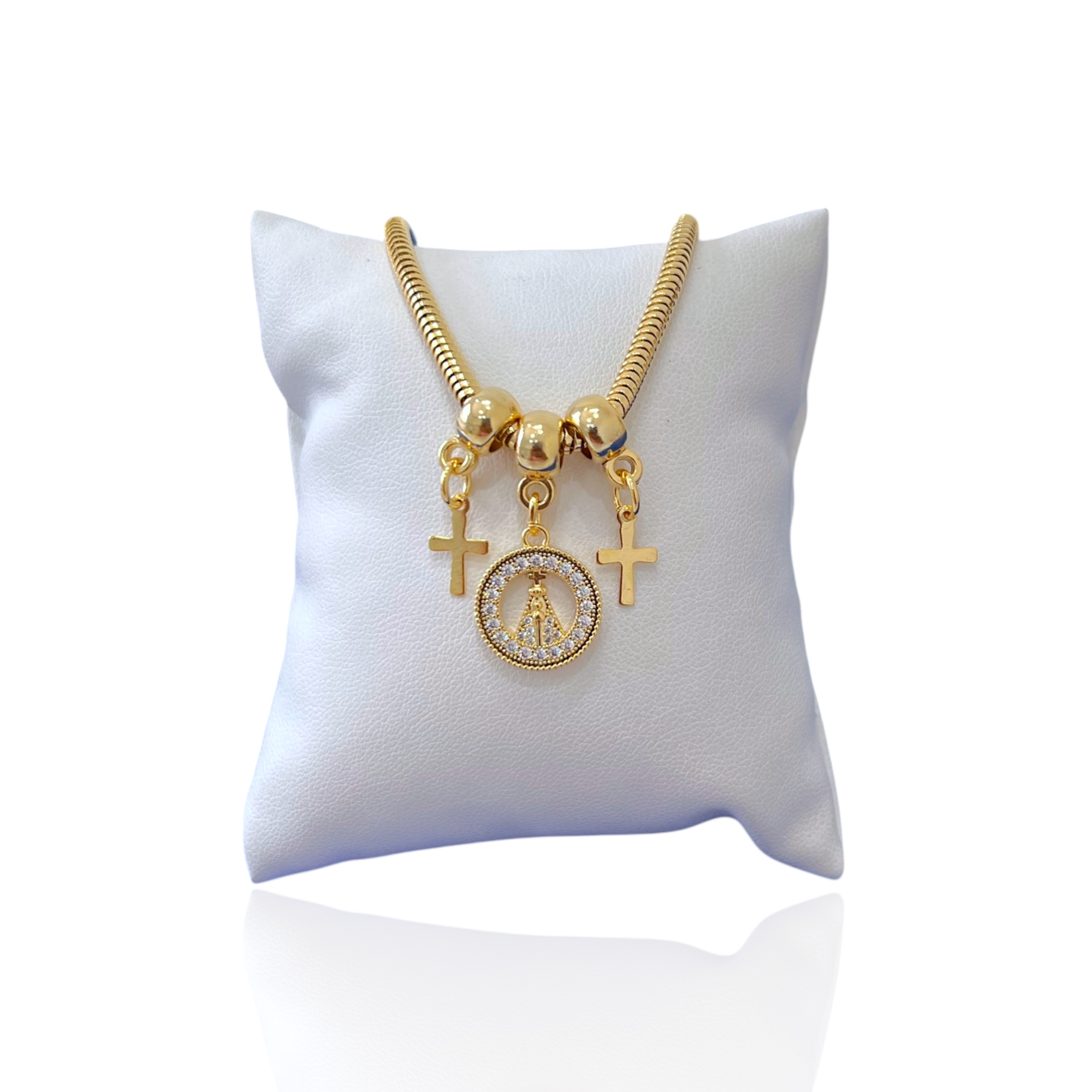 Pulseira Folheada Ouro 18k Malha Nossa Senhora Cruz Cravejada
