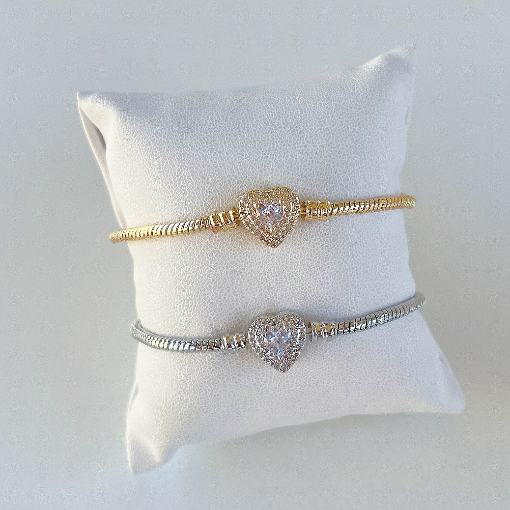 Pulseira Inspired Pandora Coração Cristal Cravejado Folheada Ouro 18k e Prata 925