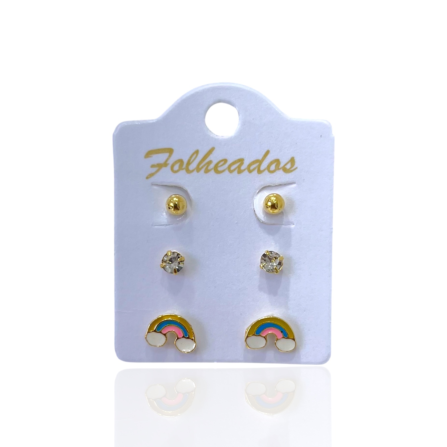 Trio Brincos Folheado Ouro 18k e Prata 925 Arco Íris