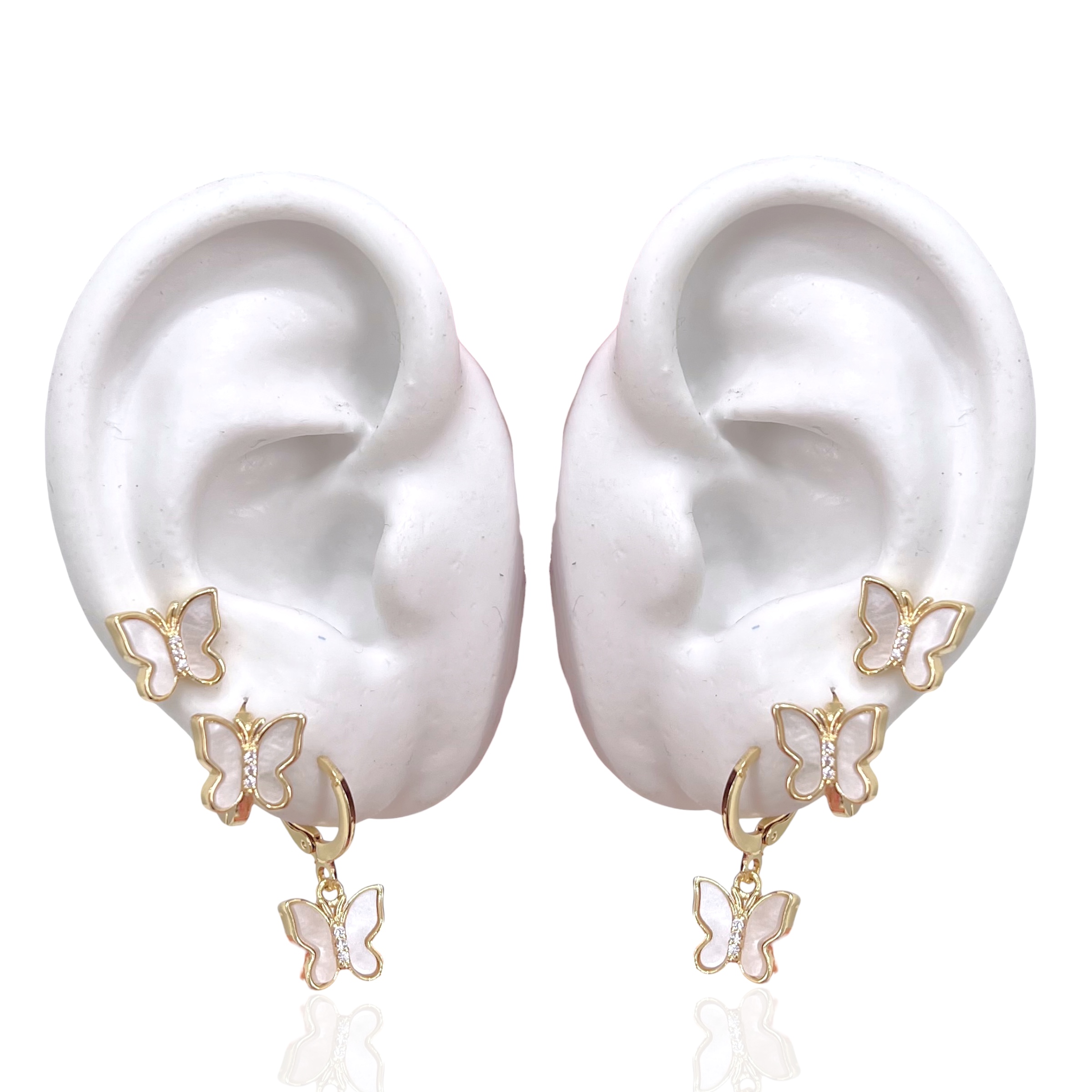 Trio Brincos Folheado Ouro 18k e Prata 925 Borboletas Madrepérola