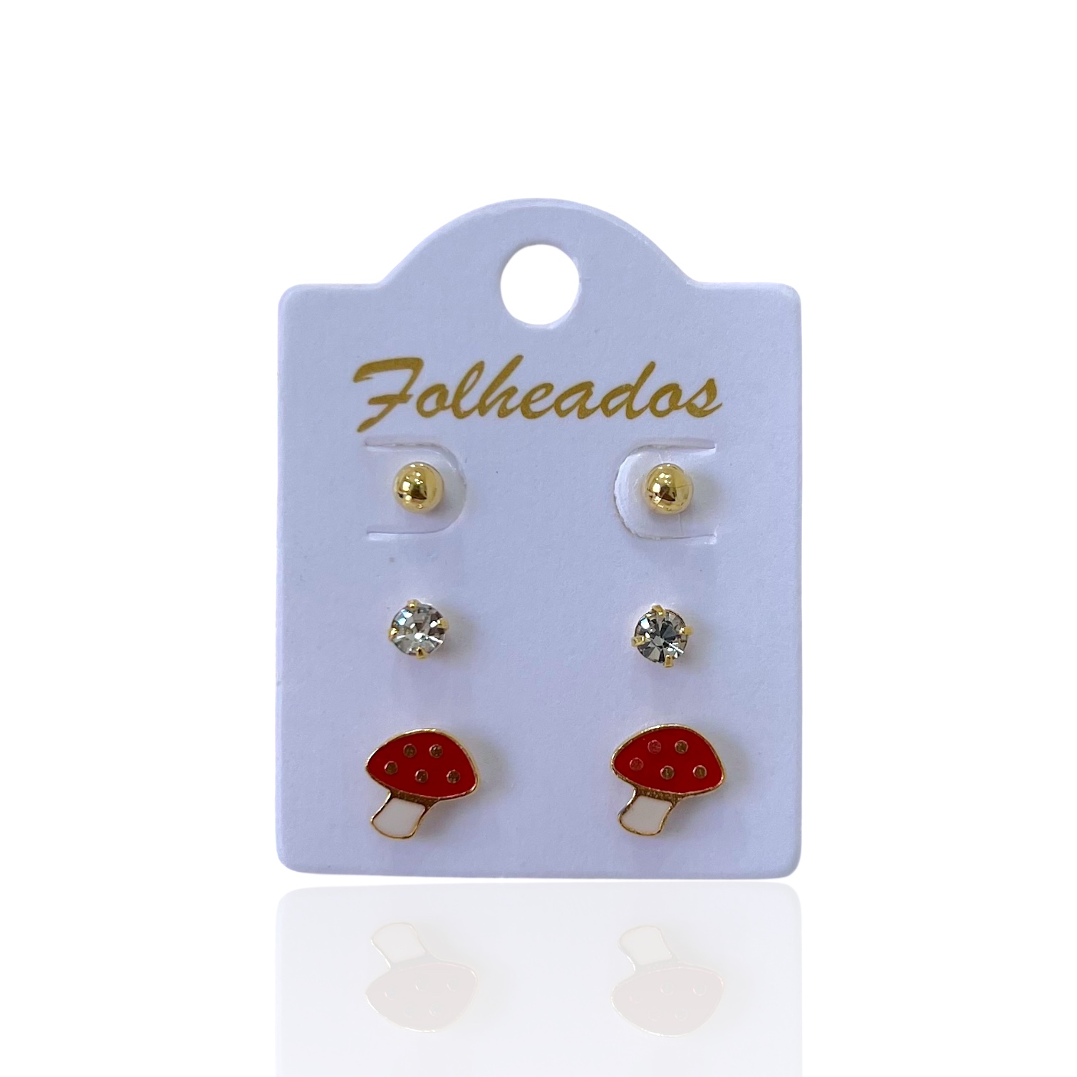 Trio Brincos Folheado Ouro 18k e Prata 925 Cogumelo