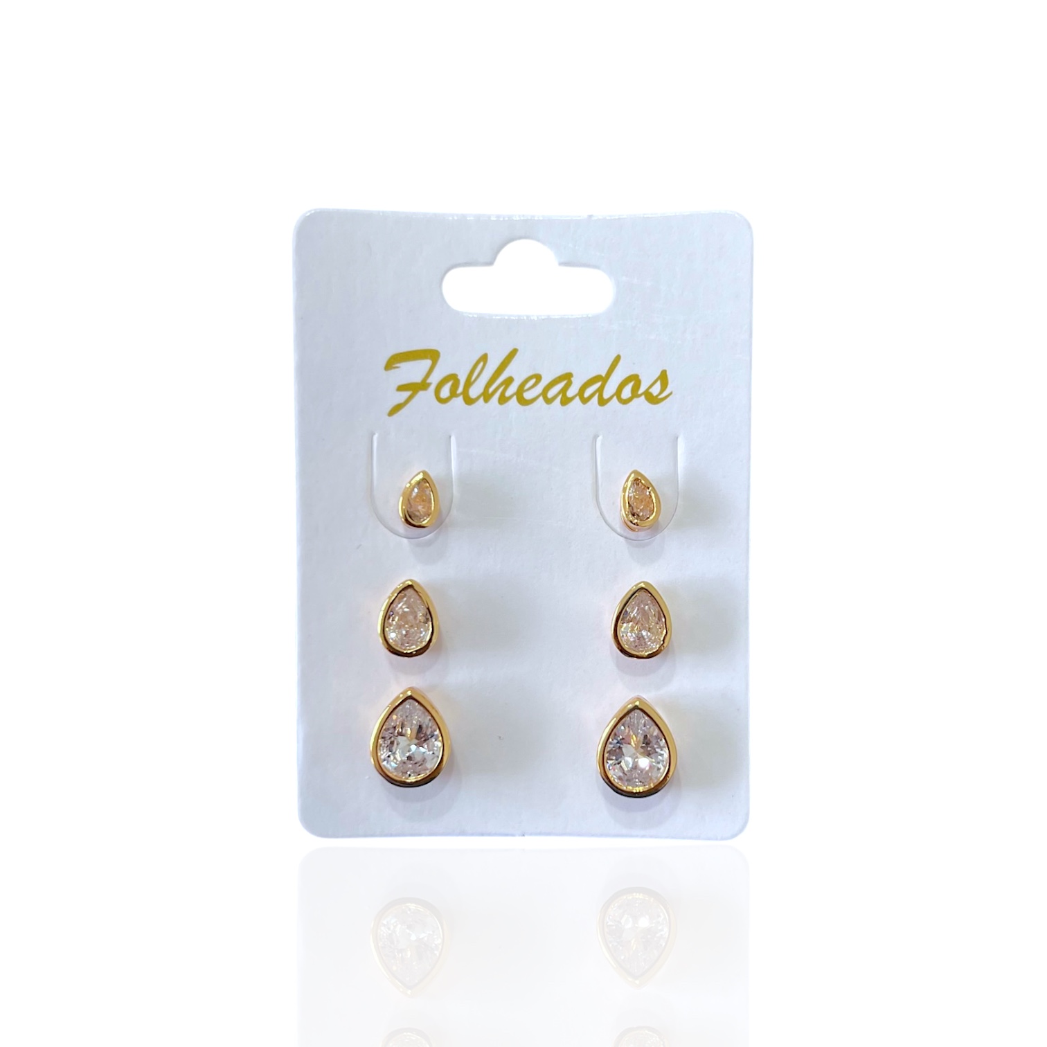 Trio Brincos Folheado Ouro 18k e Prata 925 Gota Cristal